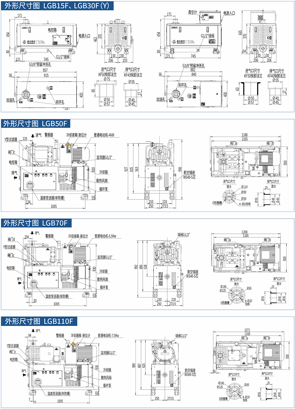 F系列風(fēng)冷干式螺桿真空泵不依賴外部循環(huán)水,通過自身獨(dú)特的風(fēng)冷降溫(LGB30F/LGB30FY)或冷凍液循環(huán)降溫(LGB70F/LGB110F)系統(tǒng)來完成熱量交換,保證了真空泵的可靠、長期運(yùn)行,是一次技術(shù)上的極大革新。